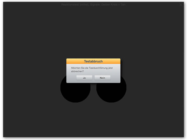In der Infozeile im oberen Randbereich wird angezeigt, auf welche Signale Sie während der Testdurchführung reagieren müssen. Außerdem die von Ihnen gewählte Testdauer. In der rechten oberen Ecke befindet sich das Feld für den Testabbruch, mit dem Sie eine laufende Testdurchführung abbrechen können.